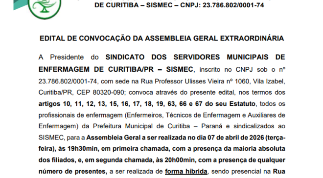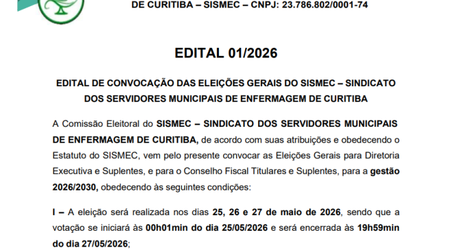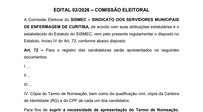 EDITAL 03/2026 – COMISSÃO ELEITORAL A Comissão Eleitoral do SISMEC – SINDICATO DOS SERVIDORES MUNICIPAIS DE ENFERMAGEM DE CURITIBA, de acordo com suas atribuições estatutárias e o estabelecido do Estatuto do SISMEC, vem pelo presente regulamentar o disposto no Estatuto, Inciso IV do Art. 72, conforme abaixo disposto: Art. 72 – Para o registro das candidaturas serão apresentados os seguintes documentos: I … II … III … IV. Cópia do Termo de Nomeação, bem como…