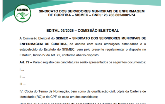 A Comissão Eleitoral do SISMEC – SINDICATO DOS SERVIDORES MUNICIPAIS DE ENFERMAGEM DE CURITIBA, de acordo com suas atribuições estatutárias e o estabelecido do Estatuto do SISMEC, vem pelo presente regulamentar o disposto no Estatuto, Inciso IV do Art. 72, conforme abaixo disposto: