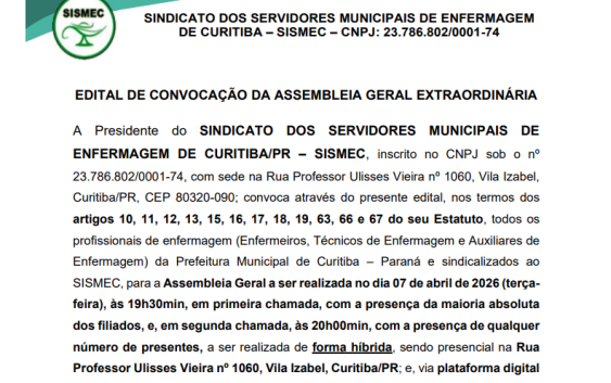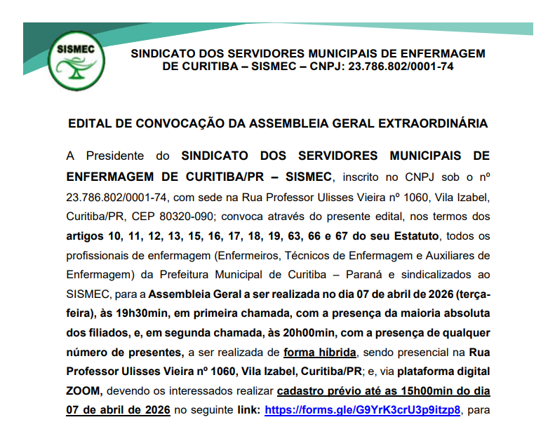 A Presidente do SINDICATO DOS SERVIDORES MUNICIPAIS DE ENFERMAGEM DE CURITIBA/PR – SISMEC, inscrito no CNPJ sob o nº23.786.802/0001-74, com sede na Rua Professor Ulisses Vieira nº 1060, Vila Izabel, Curitiba/PR, CEP 80320-090; convoca através do presente edital, nos termos dos artigos 10, 11, 12, 13, 15, 16, 17, 18, 19, 63, 66 e 67 do seu Estatuto, todos os profissionais de enfermagem (Enfermeiros, Técnicos de Enfermagem e Auxiliares de Enfermagem) da Prefeitura Municipal de Curitiba – Paraná e sindicalizados ao SISMEC, para a Assembleia Geral a ser realizada no dia 07 de abril de 2026 (terça-feira), às 19h30min, em primeira chamada, com a presença da maioria absoluta dos filiados, e, em segunda chamada, às 20h00min, com a presença de qualquer número de presentes, a ser realizada de forma híbrida, sendo presencial na Rua Professor Ulisses Vieira nº 1060, Vila Izabel, Curitiba/PR; e, via plataforma digital ZOOM, devendo os interessados realizar cadastro prévio até as 15h00min do dia 07 de abril de 2026 no seguinte link: https://forms.gle/G9YrK3crU3p9itzp8, para receber o link da assembleia virtual e/ou confirmar a presença na sede do SISMEC, com votação de forma híbrida (presencial e virtual), a qual será computada no momento da realização da Assembleia, com a seguinte ordem do dia: