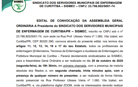 DE ENFERMAGEM DE CURITIBA/PR – SISMEC, inscrito no CNPJ sob o nº 23.786.802/0001-74, com sede na Rua Prof. Ulisses Vieira nº 1.060, Vila Izabel, em Curitiba/PR, CEP 80320 090; convoca através do presente edital, nos termos dos artigos 11, 12, 13, 14, 16 e 17 do seu Estatuto, todos os profissionais de enfermagem (Enfermeiros, Técnicos de Enfermagem e Auxiliares de Enfermagem) da Prefeitura Municipal de Curitiba – Paraná devidamente sindicalizados ao SISMEC, para a Assembleia Geral Ordinária a ser realizada no dia 20 de outubro de 2025 (segunda-feira), às 19h 30min, em primeira chamada, com a presença da maioria absoluta dos filiados e, em segunda chamada, trinta minutos após, com a presença de qualquer número de presentes; a ser realizada de forma hibrida, sendo presencial na Rua Professor Ulisses Vieira nº 1.060, Vila Izabel, em Curitiba/PR; e, via plataforma digital ZOOM, onde os interessados deverão realizar