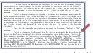 Em respeito aos servidores da Enfermagem concursados pelo Município de Curitiba, sejam estes Auxiliares de Enfermagem, Técnicos de Enfermagem ou Enfermeiros, informamos que recentemente, em cumprimento a uma ordem judicial, fora finalmente expedido o Registro Sindical junto ao CNES, o que nos tornou como única entidade sindical a representar as categorias acima mencionadas.