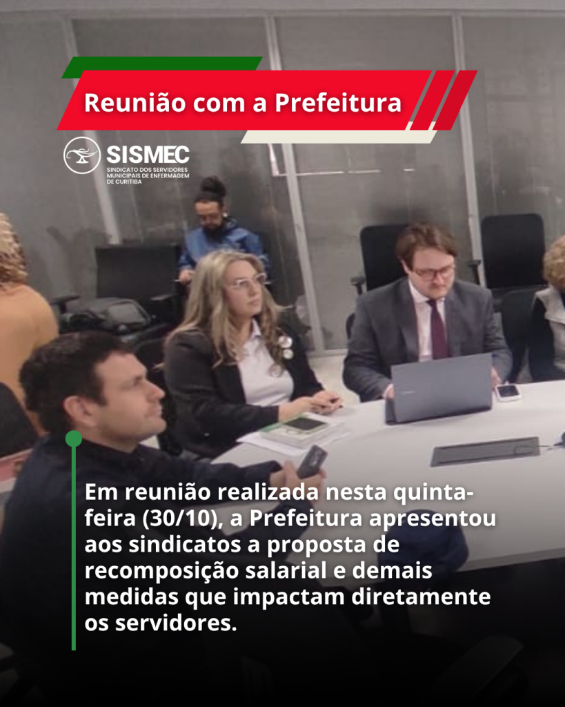 Na reunião realizada nesta quinta-feira (30/10), a Prefeitura de Curitiba apresentou aos sindicatos a proposta de recomposição salarial dos servidores municipais. O índice anunciado foi de 5,17%, correspondente à inflação medida pelo IPCA/IBGE entre outubro de 2024 e setembro de 2025. A recomposição está prevista para ser paga apenas em janeiro de 2026, mediante aprovação legislativa.